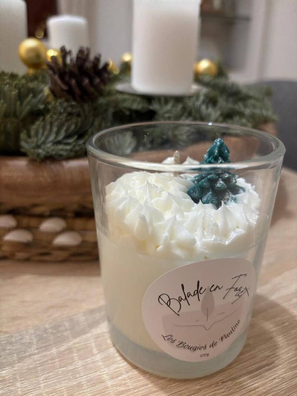 Une bougie qui rappelle une promenade hivernale en forêt pour une ambiance réconforte et festive.